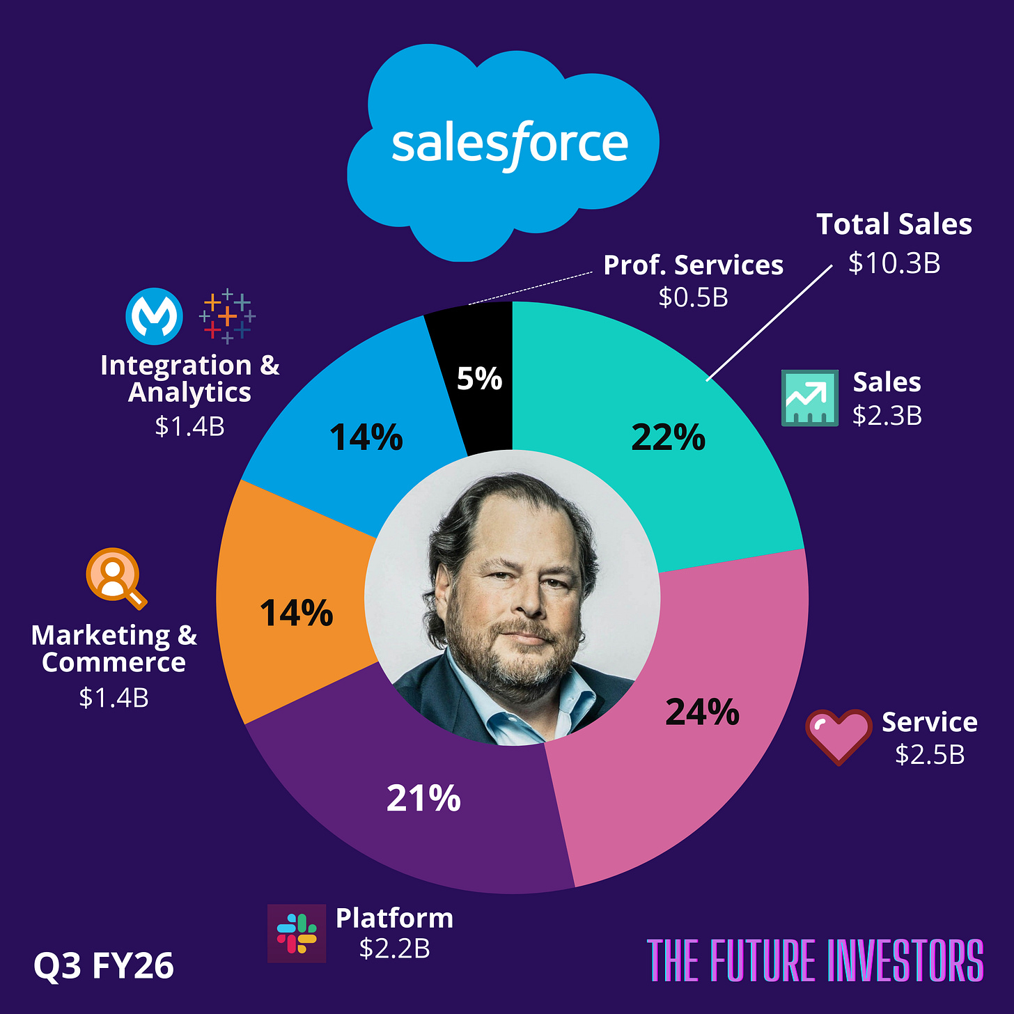 Sales and Service are the largest segments, but Marketing, Platform, and Analytics are growing fastest, showing Salesforce’s push into AI, automation, and cross-cloud adoption.